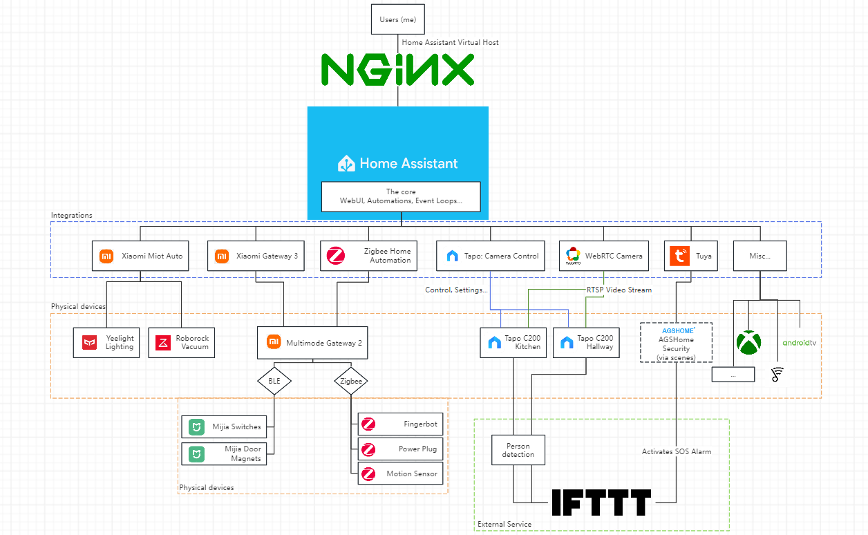 Anyways, Home Assistant is really, really fun to dive into! Everythingās localized, everythingās secure, and everything runs with basically zero latency⦠But youāve seen the problems - some functionality crucial to automating stuff across devices are just not available to Home Assistant, and everything else is just time-consuming in general. Actually, a point I havenāt mentioned yet is that all my services are proxied behind nginx. It definitely adds some complexity, but now I can access everything via the standard HTTP and HTTPS ports under different virtual hosts. I will be writing about my nginx setup some time. To be honest, itās a mess with copy-pasted configuration snippets from everywhere⦠š